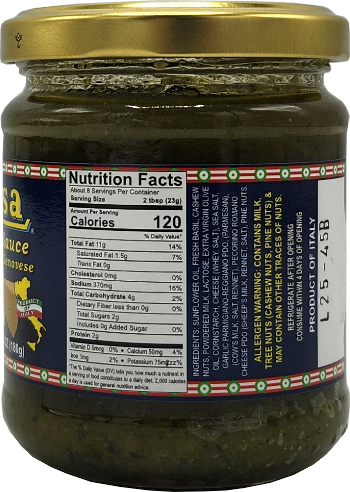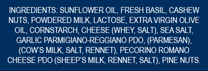INGREDIENTS: SUNFLOWER OIL, FRESH BASIL, CASHEW NUTS, POWDERED MILK, LACTOSE, EXTRA VIRGIN OLIVE OIL, CORNSTARCH, CHEESE (WHEY, SALT), SEA SALT, GARLIC PARMIGIANO-REGGIANO PDO, (PARMESAN), (COW’S MILK, SALT, RENNET), PECORINO ROMANO CHEESE PDO (SHEEP’S MILK, RENNET, SALT), PINE NUTS.