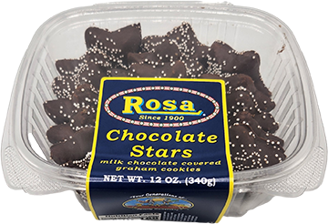 Make your season sweeter with Rosa Chocolate Stars, a festive treat that has become a beloved holiday classic. Each star-shaped cookie features a crisp graham cracker center, generously coated in smooth, creamy milk chocolate and finished with a snowy sprinkle of white nonpareils for the perfect touch of winter sparkle.